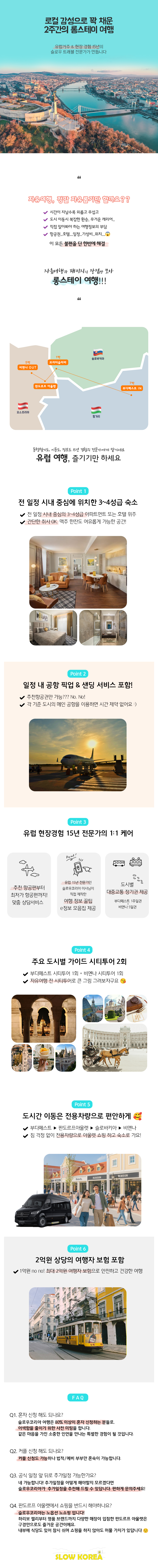 최근 <풍향고>에서 소개됐던 부다페스트와 비엔나, 화면으로만 보는 여행이 아니라 직접 야경이 아름다운 거리를 걷고 트램을 타고, 카페에 앉아 여유를 즐겨보는 여정이에요. 일정은 부다페스트 7박 → 브라티슬라바 1박 → 판도르프 아울렛 → 비엔나 5박으로 진행돼요. 도시 간 이동은 전용차량으로 편하게 이동하고, 각 도시 대중교통 정기권도 제공해드려서 현지인처럼 다녀보실 수 있어요. 부다페스트와 비엔나 시티투어도 1회씩 포함돼 있어요. 가이드는 헝가리에서 6년 이상 생활한 한국인 가이드가 직접 안내해드려요. 헝가리어가 가능해 현지 분위기와 일상을 더 깊이 연결해드릴 수 있어요. 관광지만 둘러보는 일정이 아니라, 실제 그곳의 삶을 가까이에서 경험하는 시간이 될 거예요. 슬코의 체류여행은 도시를 바쁘게 찍고 넘어가는 여행이 아니에요. 잠시 머물며 그 도시의 하루를 살아보는 여행이에요. 이번엔, 여행이 아니라 ‘살아보기’를 선택해보시는 건 어떠세요? 😊